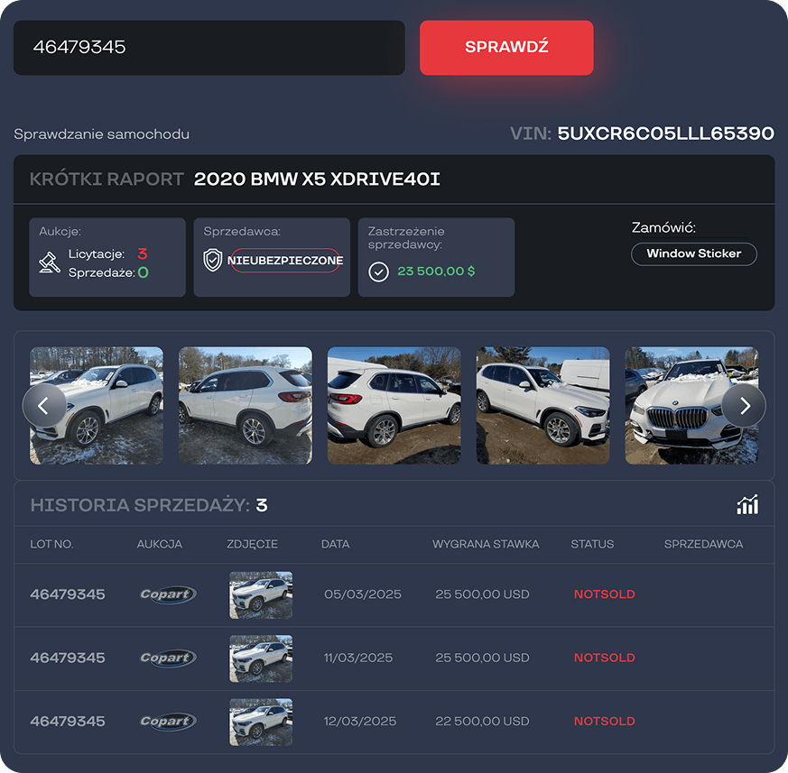 Usługa ta jest szczególnie przydatna do sprawdzenia samochodu przed jego zakupem. Pozwoli ci ona dowiedzieć się, jakie szkody zostały wyrządzone samochodowi wystawionemu na sprzedaż na poprzednich aukcjach, co uchroni cię przed zakupem nierentownej partii. Zakup samochodu od firmy ubezpieczeniowej jest również znacznie bezpieczniejszy.